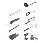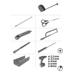| Benötigtes Werkzeug | Bleistift, Feile, Gehrungslade, Schere, Cutter , Maßband, Metallsäge, Schraubendreher Kreuz, Bohrer Ø 4mm , Bohrer Ø 8mm |